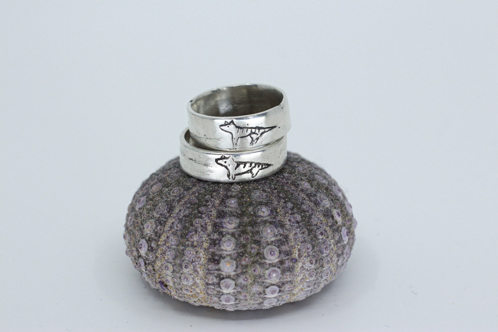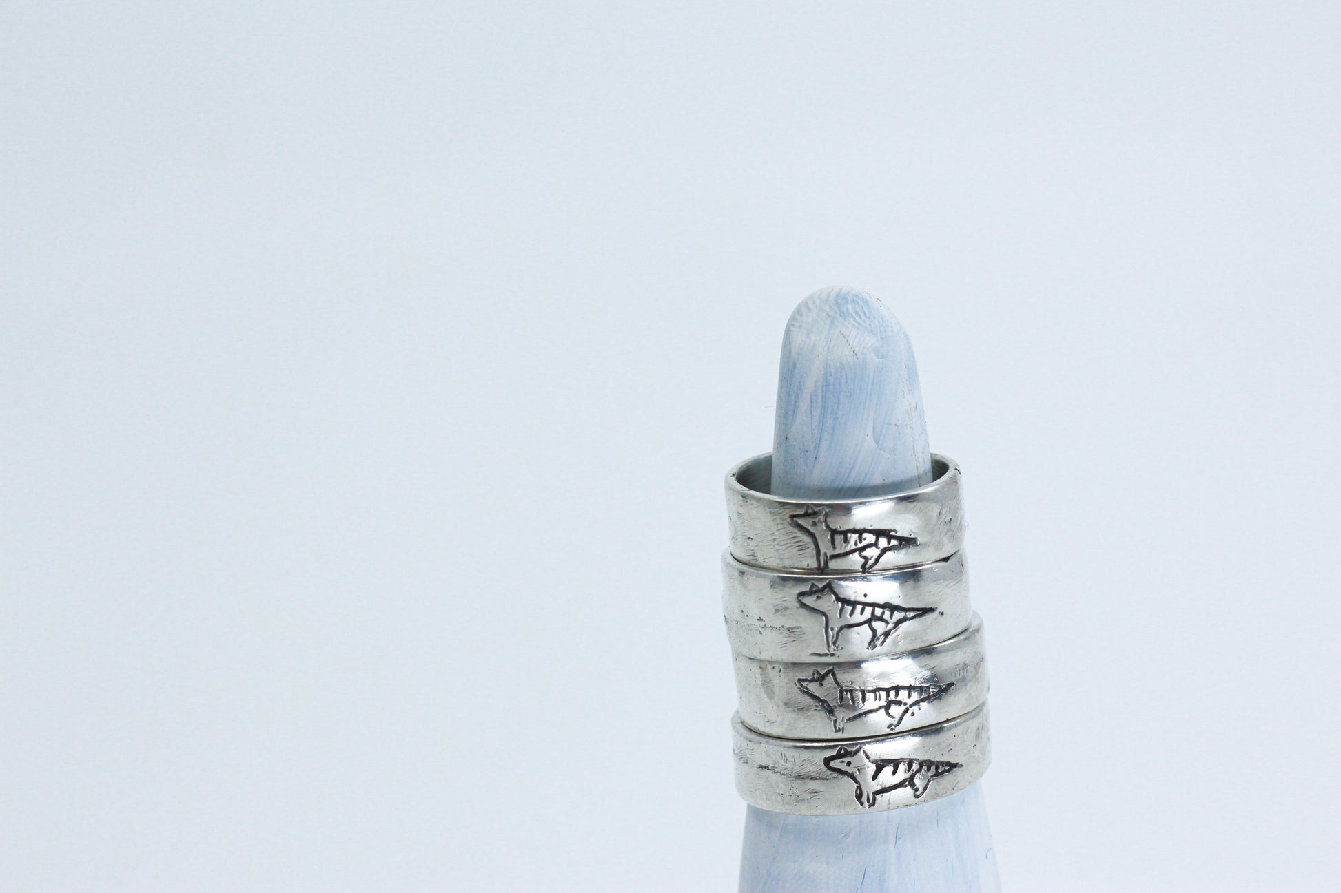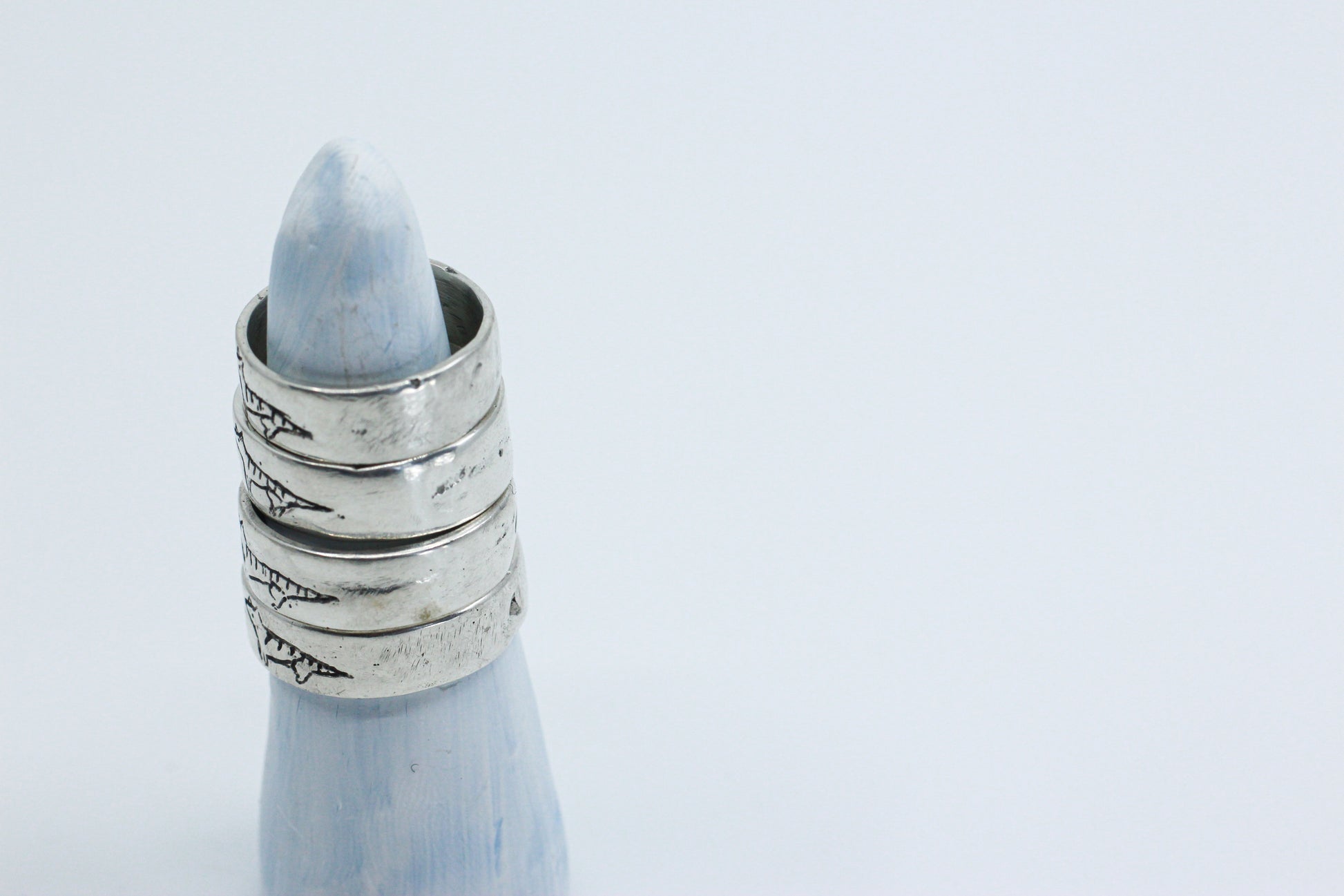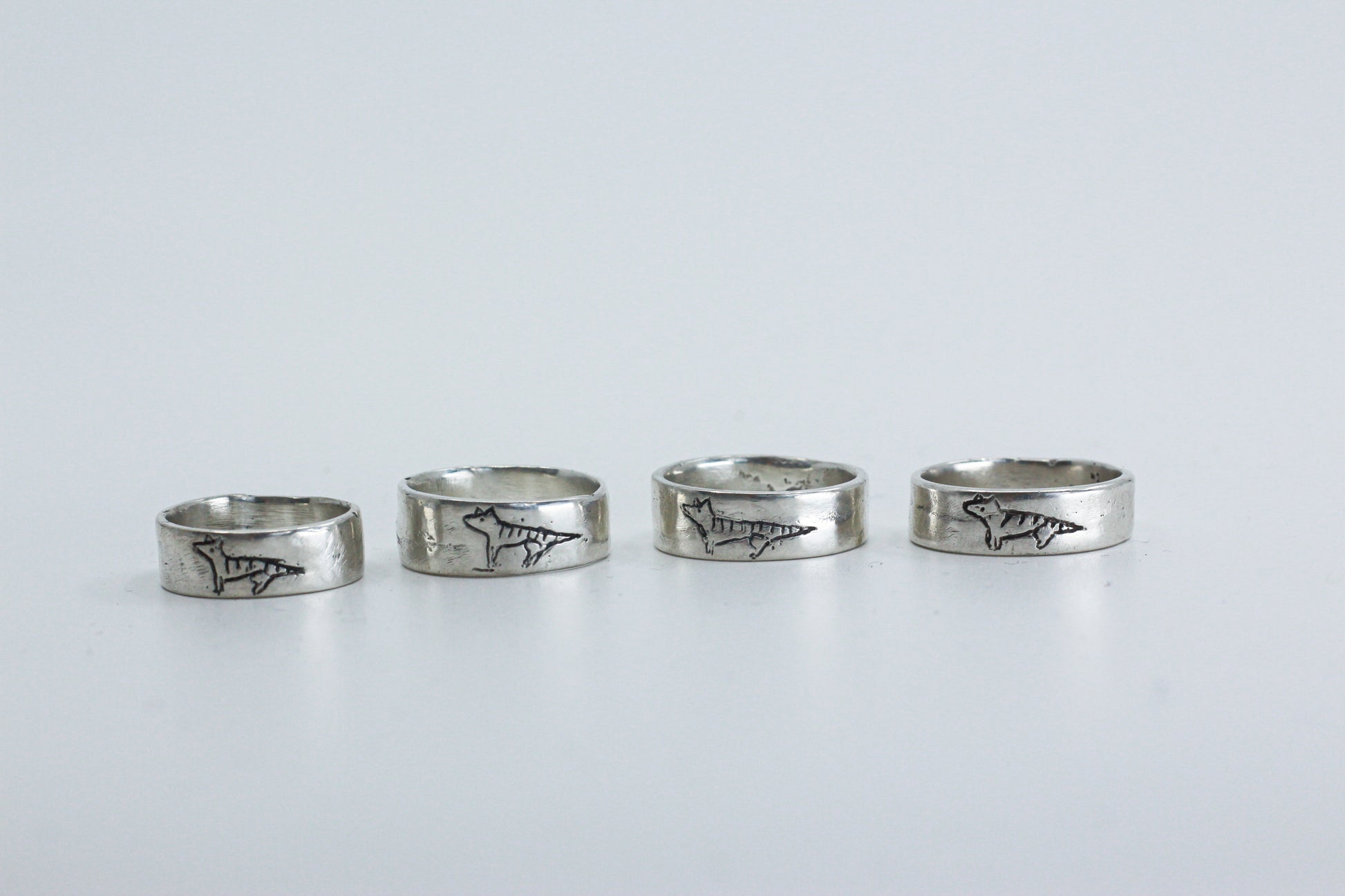 100% solid recycled 925 sterling silver, cast in sand and hand engraved. While they will all resemble those pictured, each ring will be unique in it's textures and markings.
