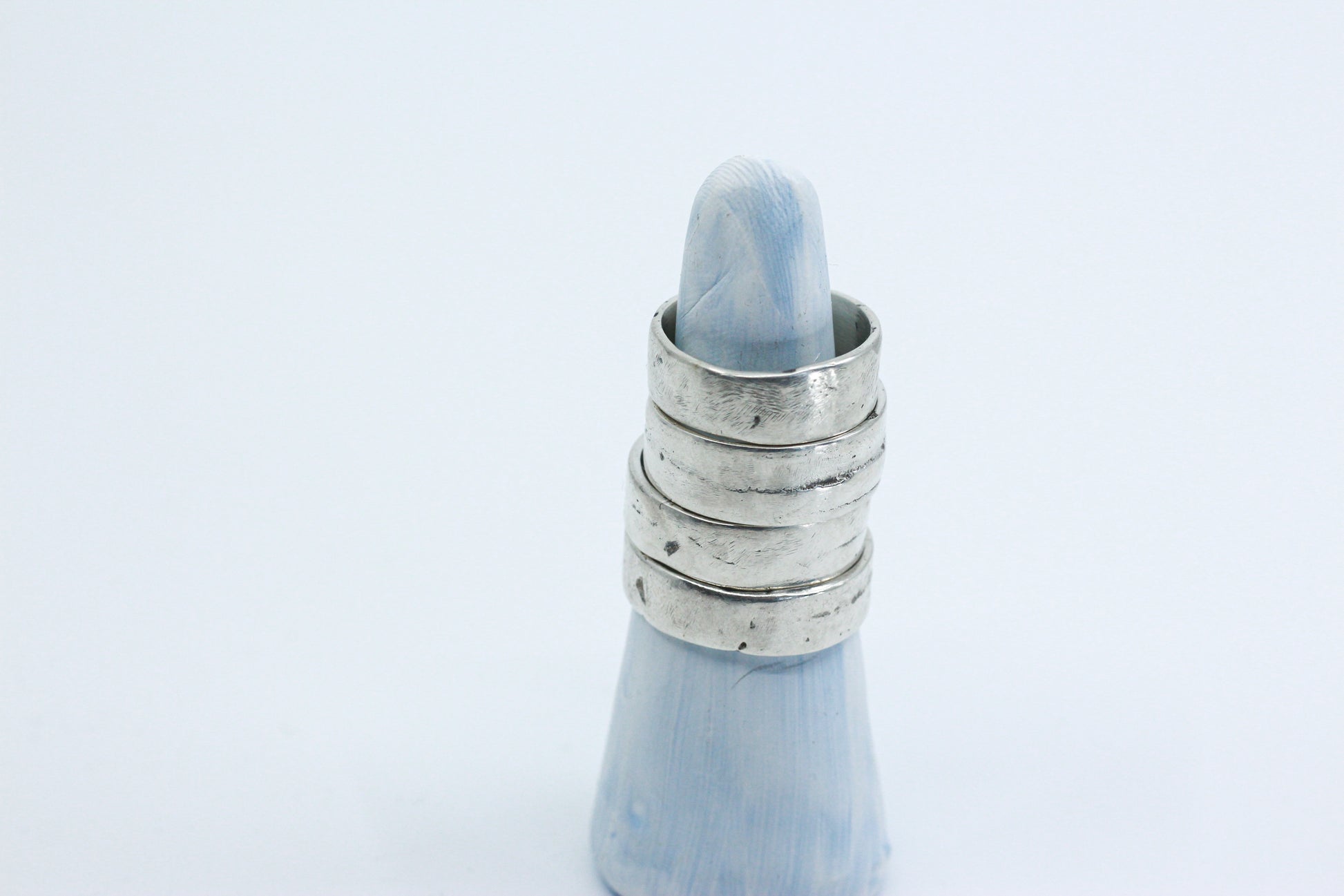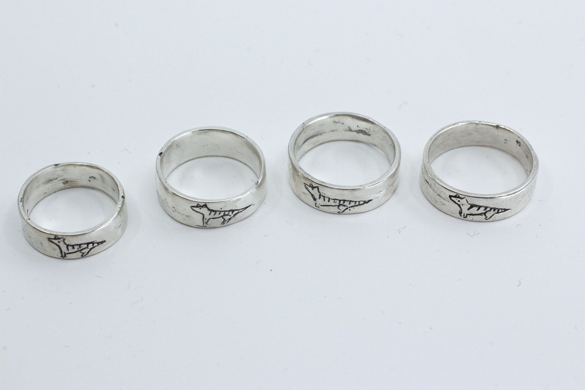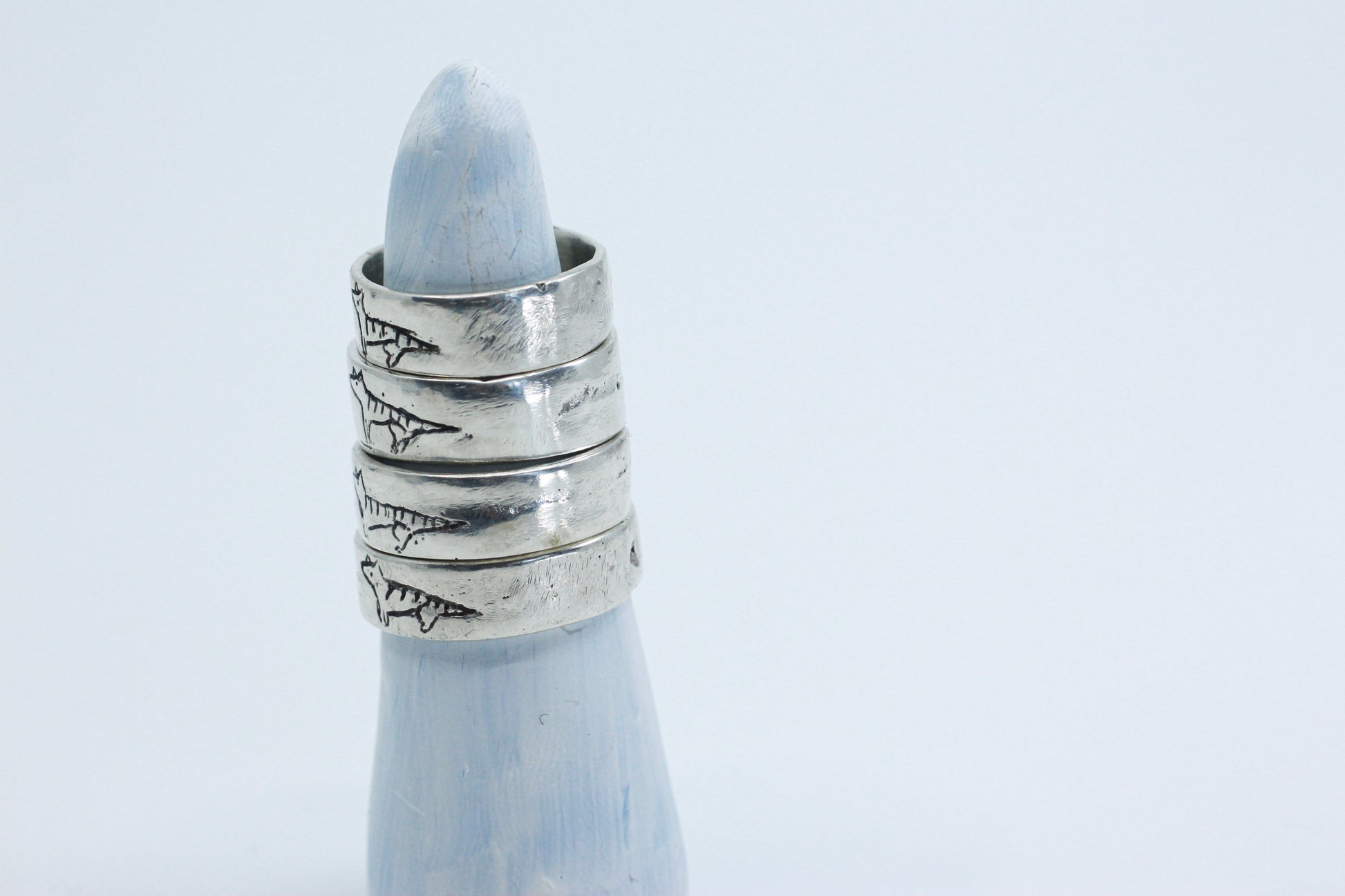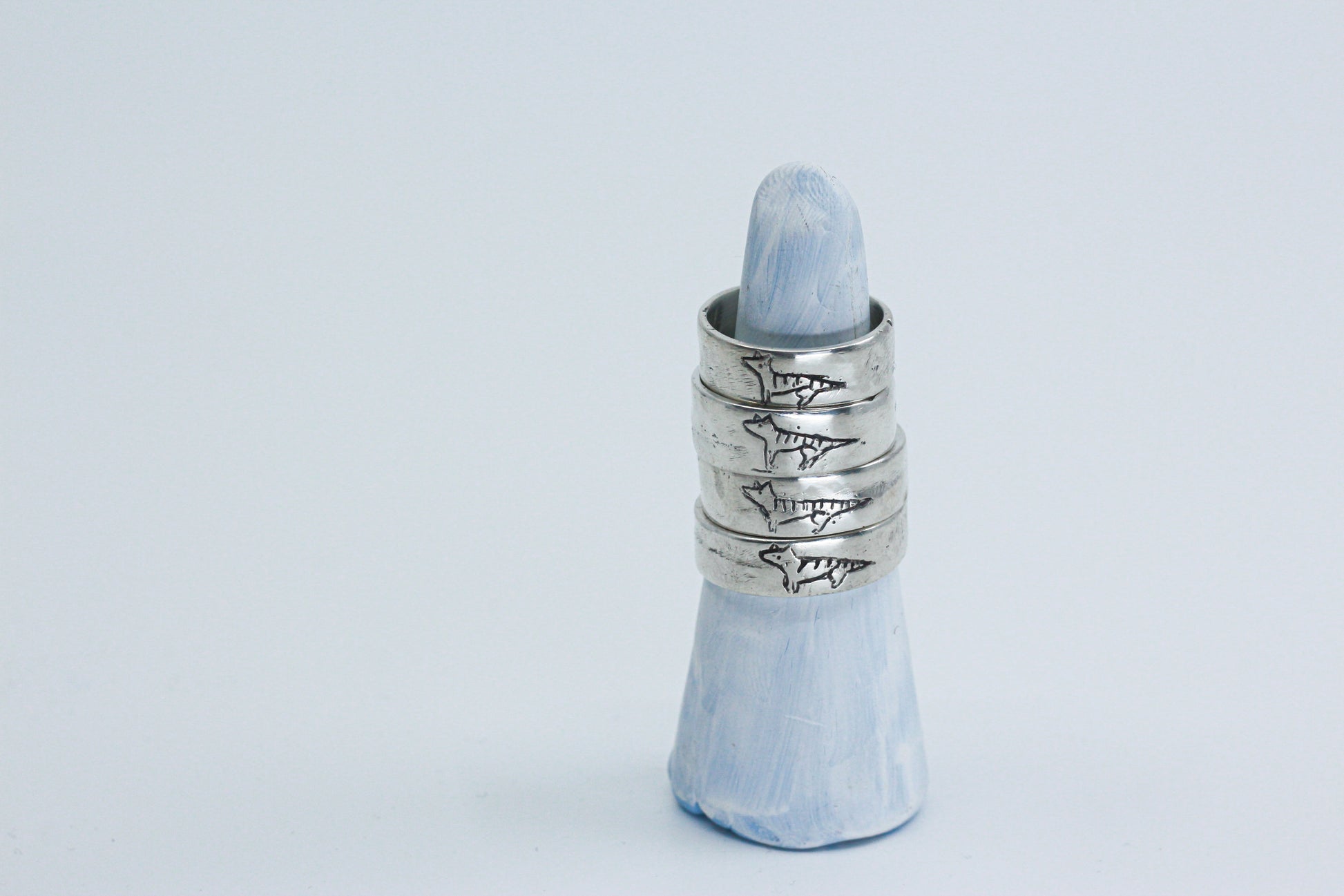 100% solid recycled 925 sterling silver, cast in sand and hand engraved. While they will all resemble those pictured, each ring will be unique in it's textures and markings.