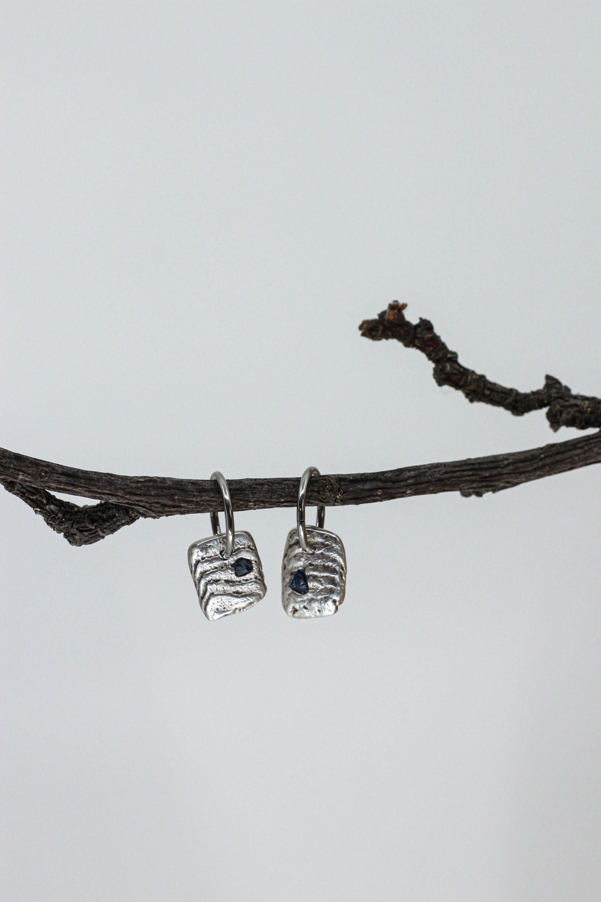 Cast by hand in Tasmania using cuttlefish bone foraged from the North-West Coast, these earrings are textured by nature. While each pair will be similar to those pictured, exact markings and stone placement will vary.