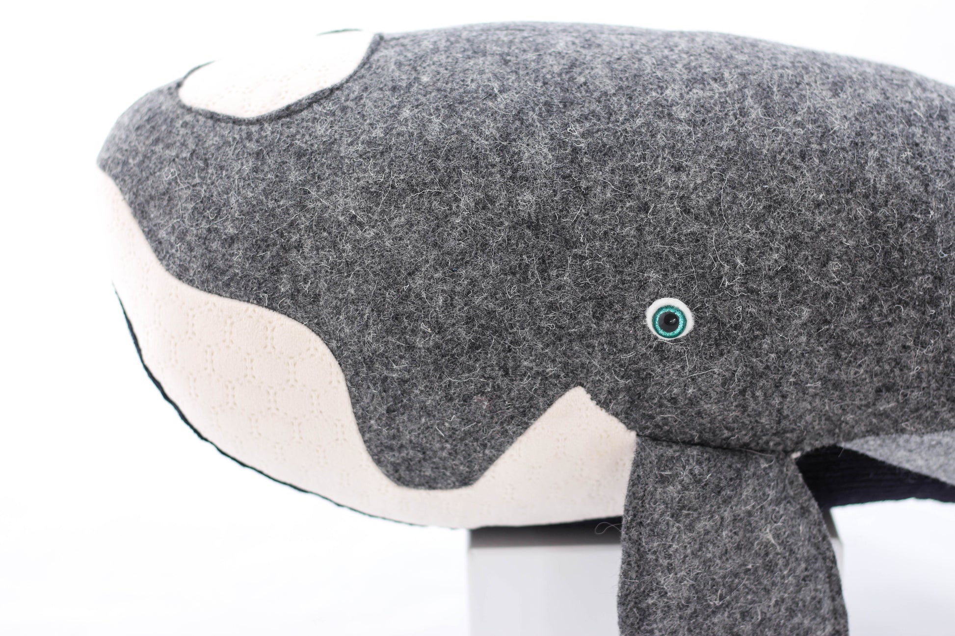 A less common shape than her humpback cousins, Sabrina is a bit unusual looking but we think her unique barnacle markings (known as callosities) and lop-sided grin are what makes her special.